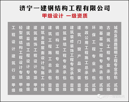 濟(jì)寧一建鋼結(jié)構(gòu)工程有限公司,隸屬中煤建設(shè)集團(tuán),集團(tuán)注冊(cè)資金1.0158億元人民幣,下設(shè)工程部、設(shè)計(jì)部、技術(shù)部、質(zhì)檢部、生產(chǎn)部、安全部。擁有鋼結(jié)構(gòu)施工、設(shè)計(jì)雙甲資質(zhì)、制造壹級(jí)資質(zhì),幕墻施工、設(shè)計(jì)雙甲資質(zhì),裝飾裝修施工、設(shè)計(jì)雙甲資質(zhì),建筑金屬屋面設(shè)計(jì)與施工特級(jí)資質(zhì),門窗施工壹級(jí)資質(zhì),并具有對(duì)外承包施工資質(zhì)和勞務(wù)輸出資質(zhì)等九項(xiàng)國家甲級(jí)資質(zhì)。主要從事鋼結(jié)構(gòu)網(wǎng)架工程、管桁架工程、裝配式輕鋼別墅工程、幕墻工程、膜結(jié)構(gòu)工程及大型儲(chǔ)罐工程的設(shè)計(jì)、生產(chǎn)與施工,公司相繼承攬了機(jī)場(chǎng)航站樓、體育場(chǎng)館、省級(jí)科技館、大型廠房、高速路服務(wù)站、國家石油儲(chǔ)庫、加油站、儲(chǔ)煤倉等各類工程,施工范圍涉及全國三十多個(gè)省、市、自治區(qū)及直轄市,工程質(zhì)量合格率100%,多年來榮獲國內(nèi)建筑界各類獎(jiǎng)項(xiàng)100余個(gè)。